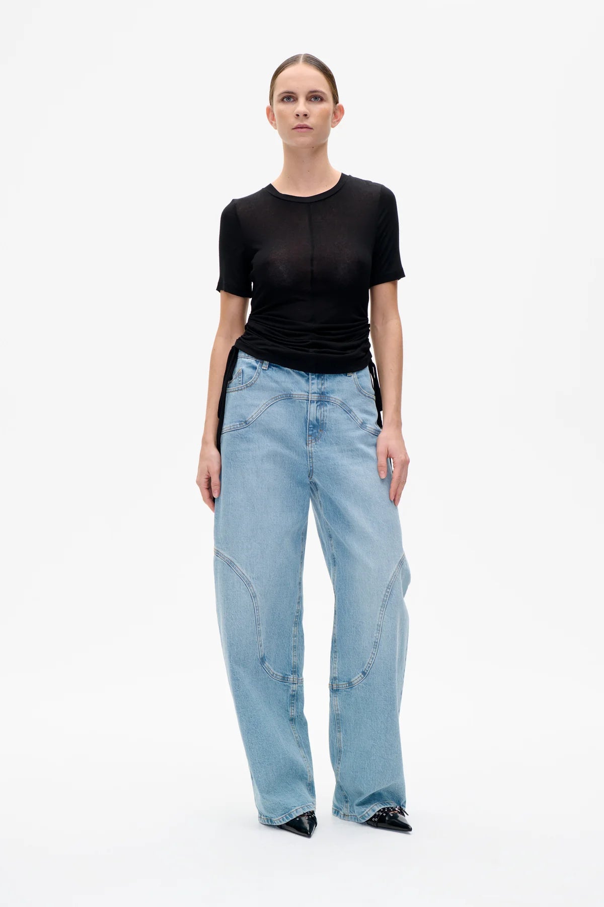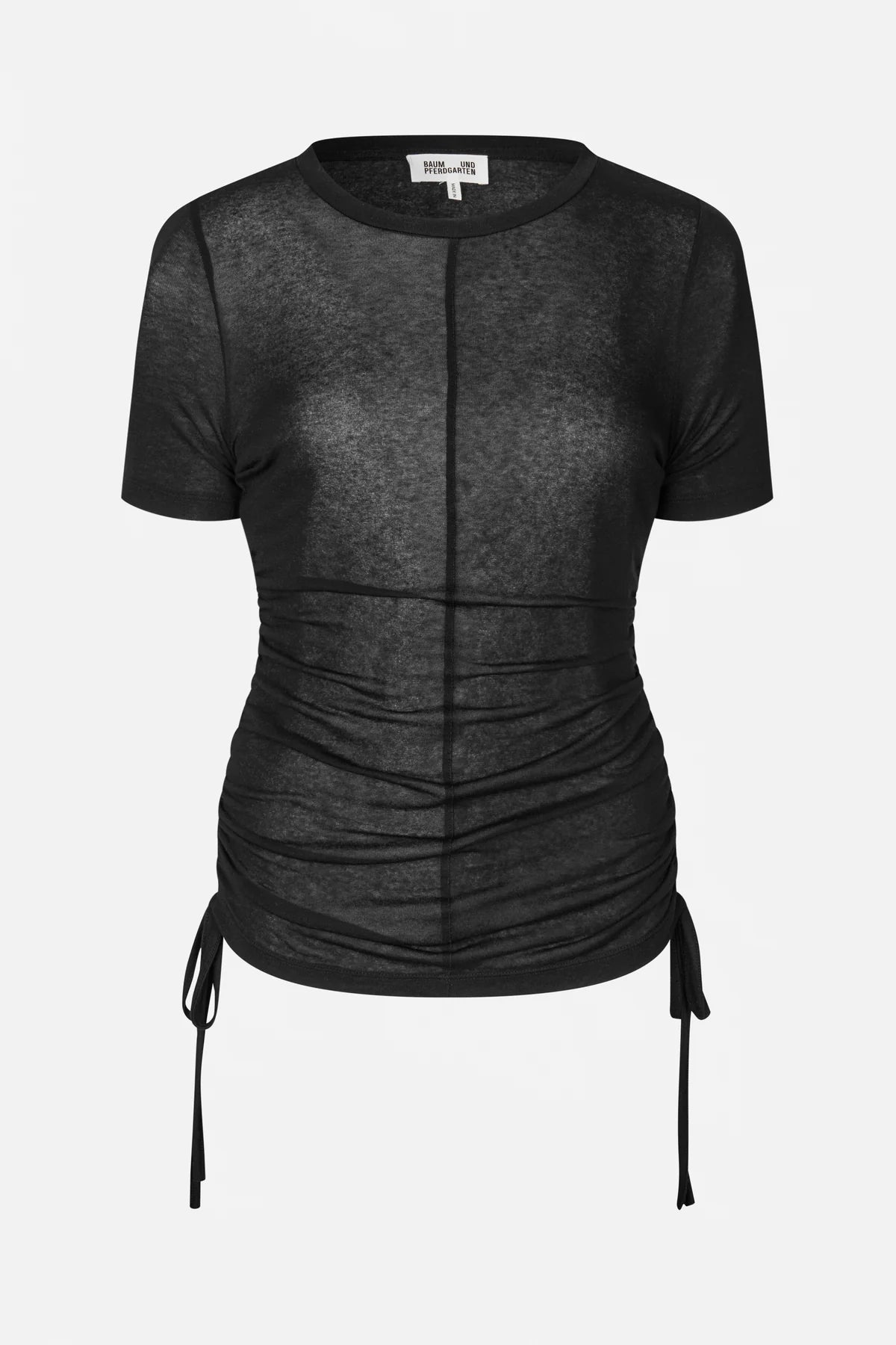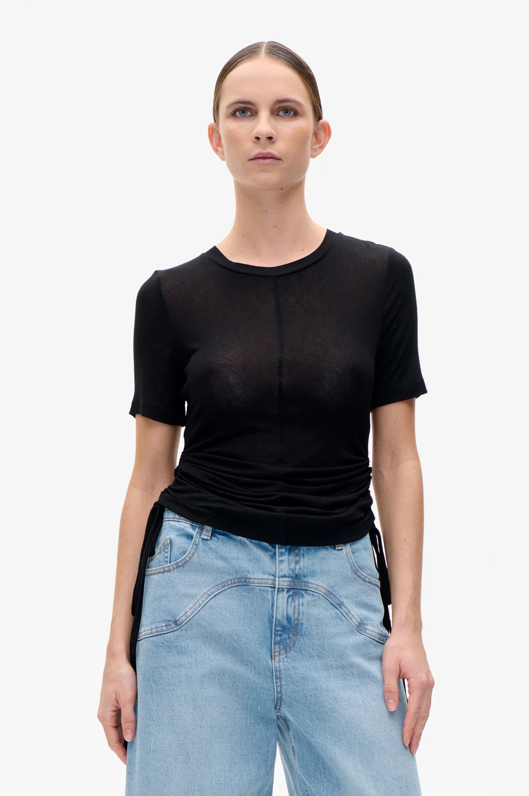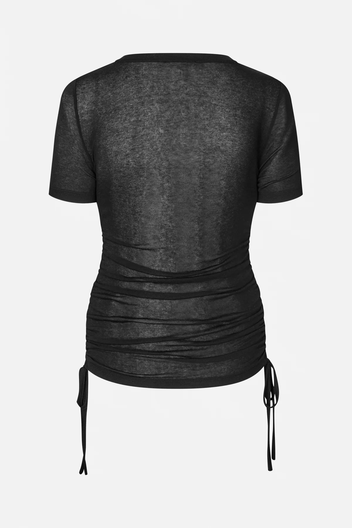 Das Jelva T-Shirt ist ein figurbetontes Oberteil mit Rundhalsausschnitt und verstellbaren Bändern an den Seiten, die Raffung erzeugen.