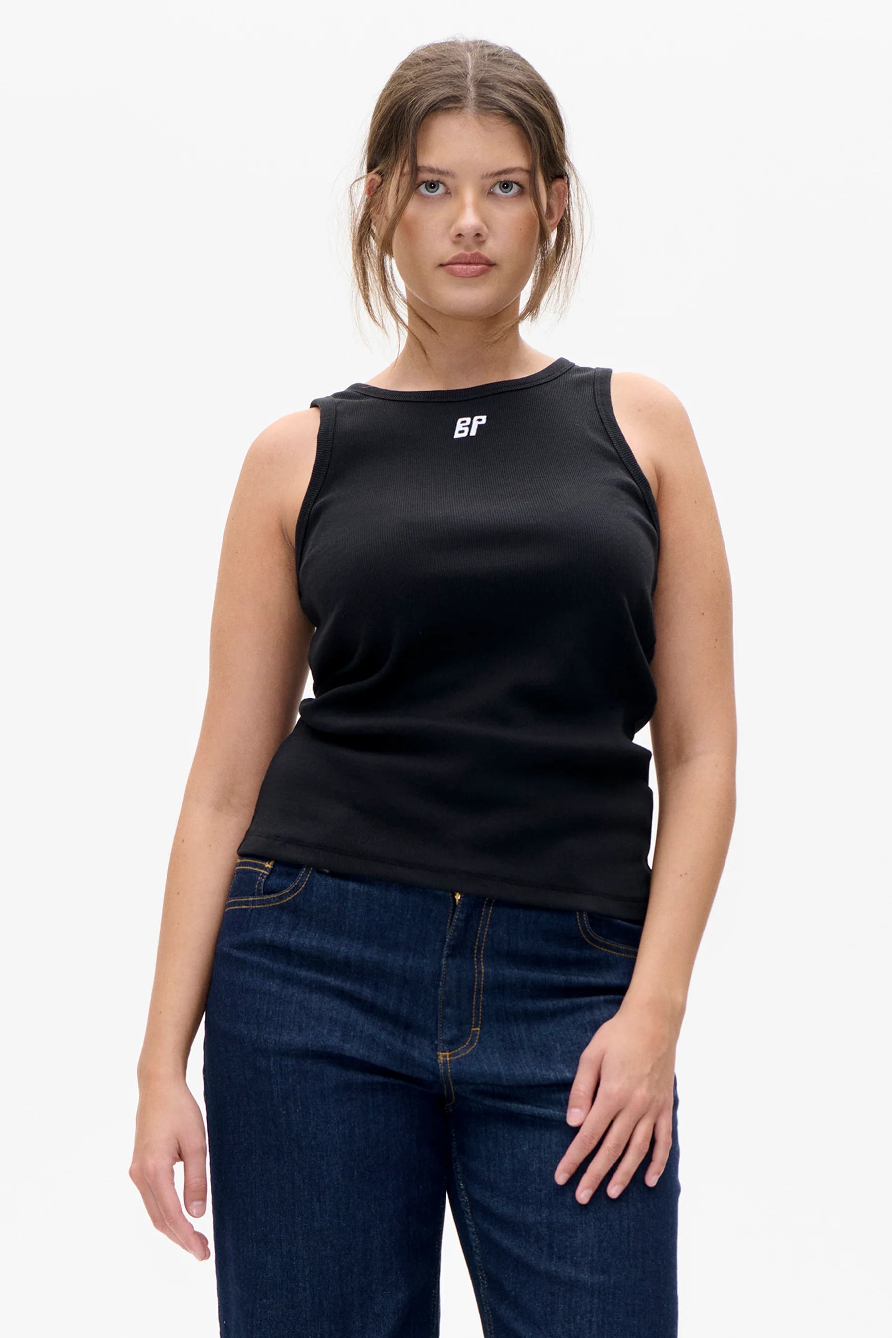 Das Joly Top ist ein Tanktop mit hohem Rundhalsausschnitt aus gerippter Bio-Baumwolle. Es ist mit einem gestickten Logo auf der Vorderseite gestaltet.
