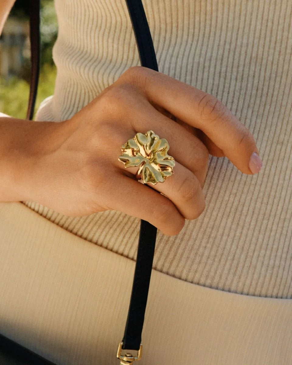 In der Gerana-Serie stehen große, fließende Blütenblattformen im Mittelpunkt. Am ausdrucksstarken Ring der Serie in 14-karätiger Vergoldung entfaltet sich die stilisierte Blütenblattform wunderschön über der Hand. Modern, stilvoll und elegant. Kombiniere ihn gerne mit weiteren Schmuckstücken der Serie