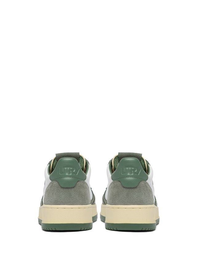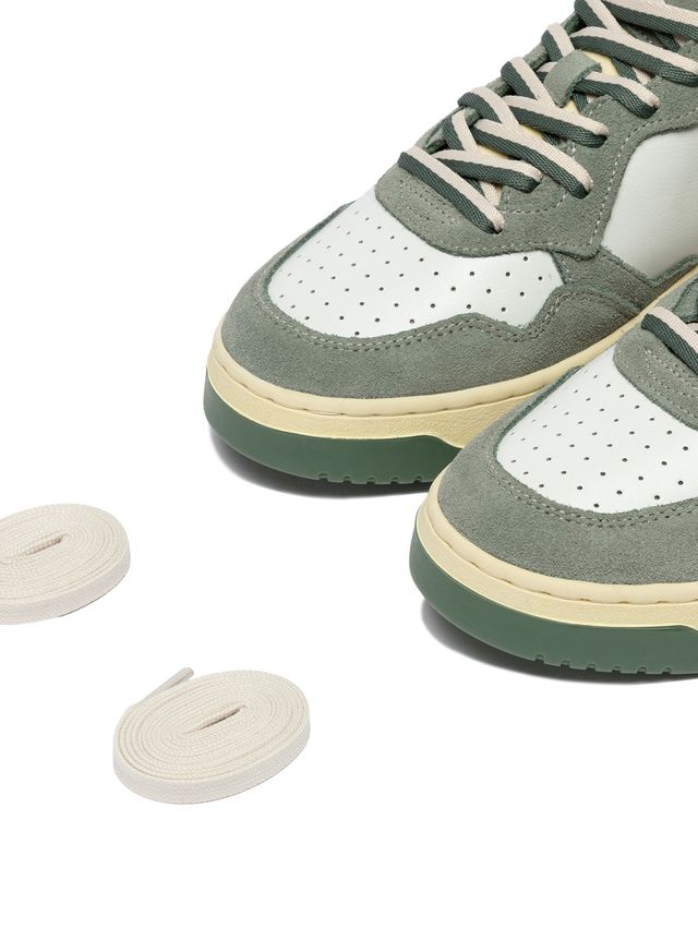 Gemacht aus weichem Leder mit einem authentischen Look, verfügt er über ein auffälliges Color-Block-Muster in Weiß und grün und eine Sohle aus Naturgummi mit einem Profil in Beige, das den Rhythmus deiner Schritte vorgibt.
