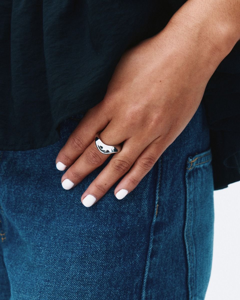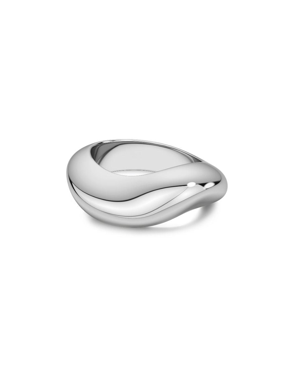 Die skulpturalen und fließenden Formen von Azura bieten ein intimes Sinneserlebnis in einem Design, das einen zeitlosen und eleganten Eindruck macht, egal mit was es gestylt wird. Hier in einem Ring aus glänzendem Edelstahl mit einer schönen organischen Form, die gut sitzt.
