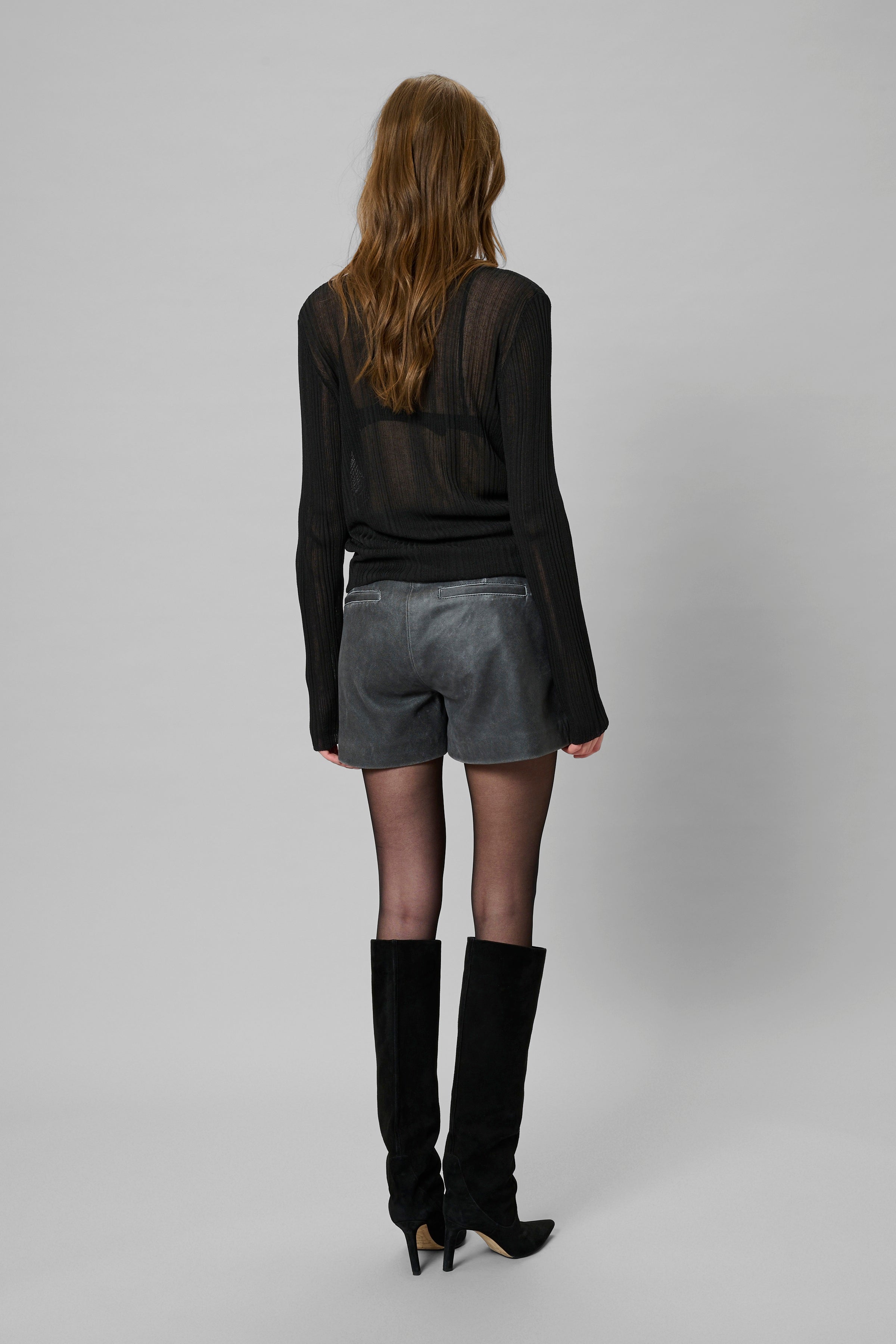 Transparenter, gerippter Rollkragenpullover mit figurbetonter Silhouette, langen Ärmeln und leichter, halbtransparenter Optik.