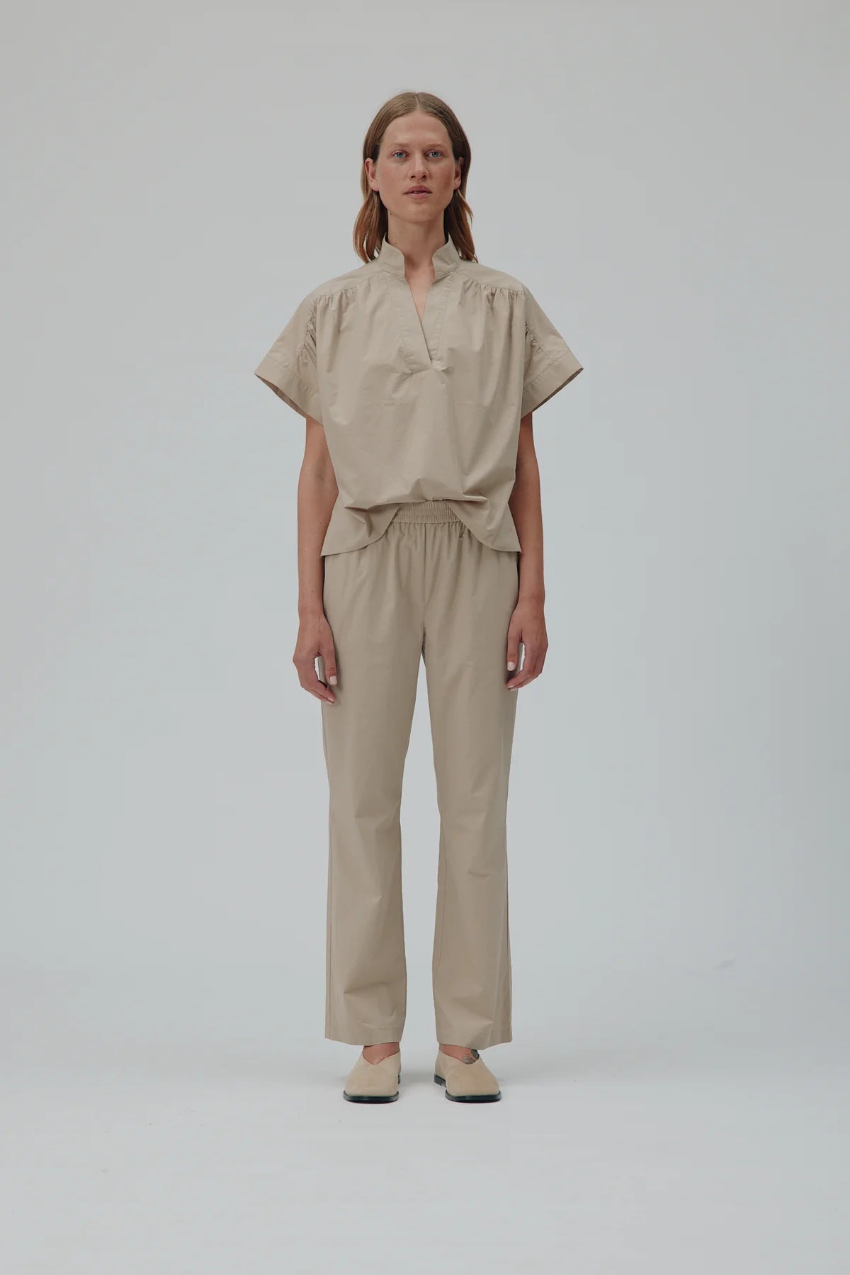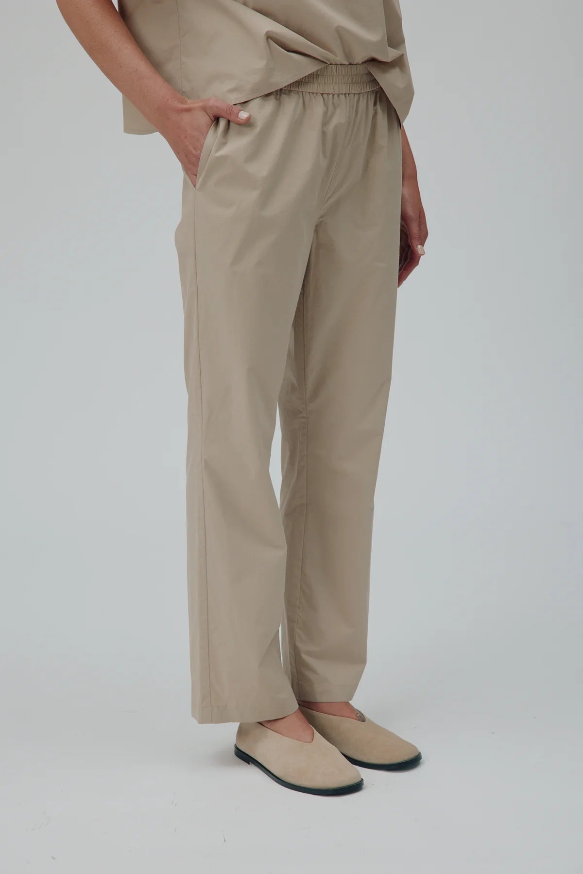 Nellie ist eine gerade geschnittene Hose aus 100 % Baumwolle. Sie verfügt über einen elastischen Bund und Seitentaschen und bietet einfachen und eleganten Komfort für den Alltag.