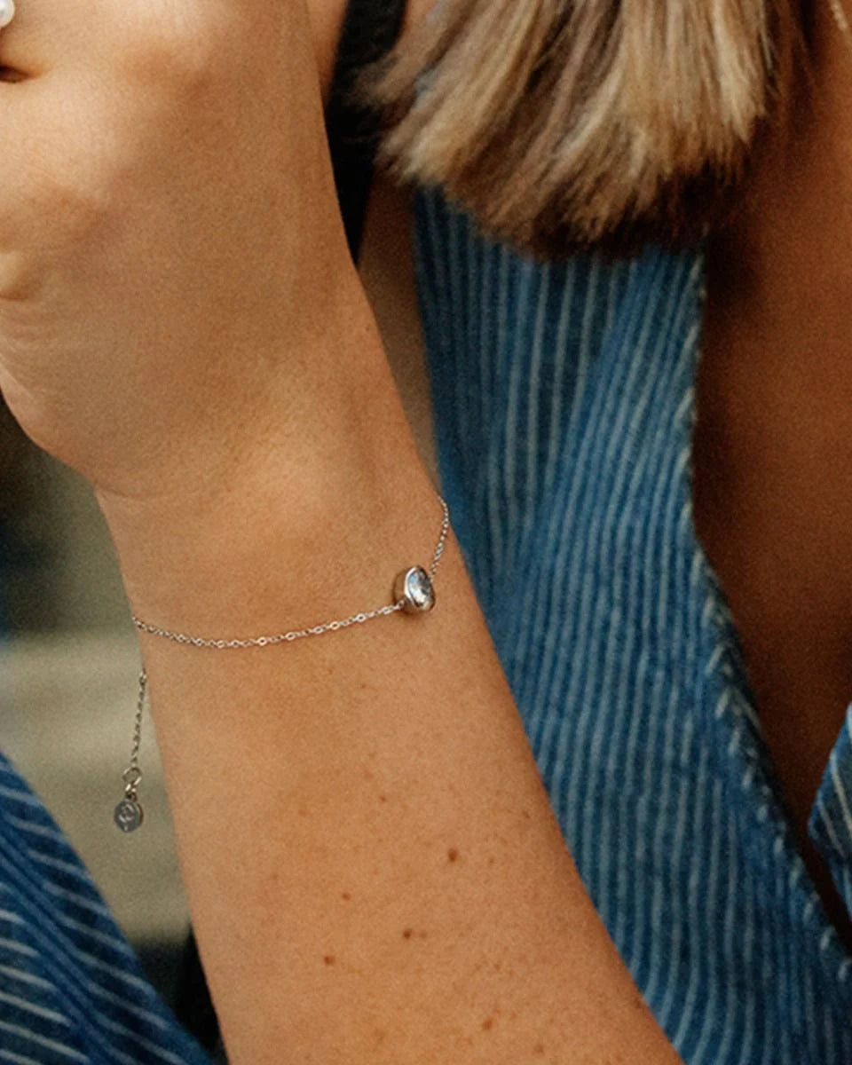 Ocean Gem vereint organische Formen mit lichtreflektierenden Details, inspiriert von den sanften Konturen von Muscheln und dem Spiel der Sonne auf der Wasseroberfläche. Das elegante Armband aus glänzendem Edelstahl hat einen großen, funkelnden Stein, der in eine schöne facettierte Ankerkette integriert ist. Schön zu kombinieren mit den Ohrringen oder dem Ring der Serie