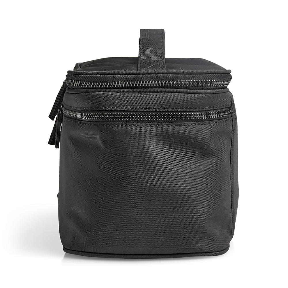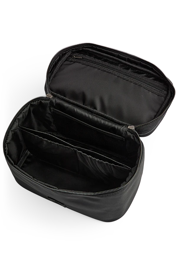 Das obere Reißverschlussfach enthält Fächer für Make-up-Pinsel und eine Reißverschlusstasche.